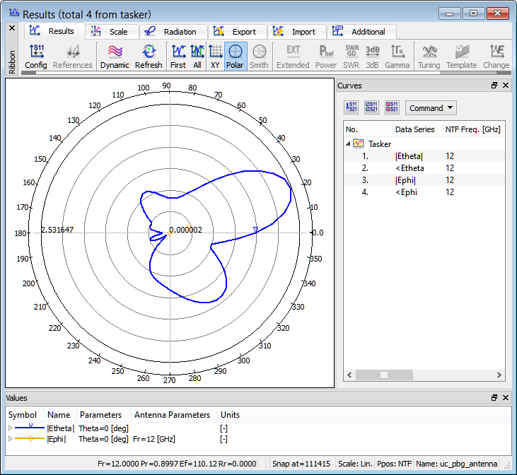The radiation pattern calculation is set at 12 GHz.