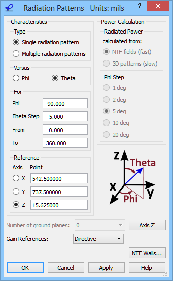 We wish to calculate the 2D radiation patterns versus angle Theta varying between 0 and 360 degrees with a step of 5 degree. They will be calculated with a constant angle Phi equal to 90 degrees. The definition of the angles is explained in the lower right part of the 2D Radiation Patterns configuration dialogue. Note that this definition depends on the choice of the reference axis. The angle Theta is always counted from the reference axis (Z in the considered example). The angle Phi is always counted around it.