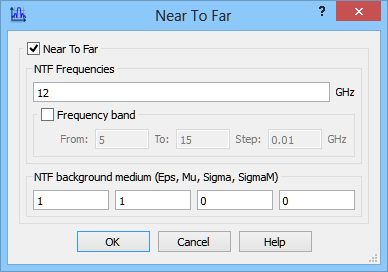 We can also set the reference point or in other words the origin of the coordinate system for the NTF transformation. The position of the reference point does not influence the absolute values of the radiation patterns (in lossless NTF background medium) but it does influence their phase characteristics. Moving the reference point can be helpful in a search for the antenna electrical centre. The reference point position is expressed in the same coordinates and units as those used in the project and defined in QW-Editor. To recall what units have been used, we can just take a look at the title bar of the window. In the considered example we see Units: mm.