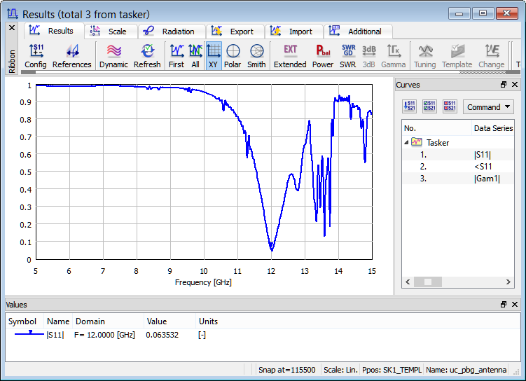 For the purpose of calculating reflection characteristic, S-Parameters postprocessing is activated from 5 GHz to 15 GHz, with a frequency step of 0.01 GHz.