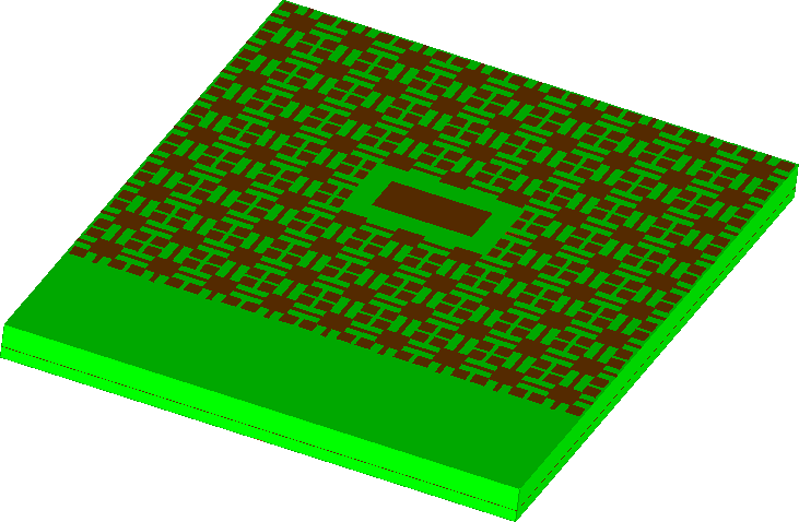 Simulation model consists of the aperture-coupled patch antenna on a uniplanar photonic-bandgap substrate surrounded by NTF and PML boxes.