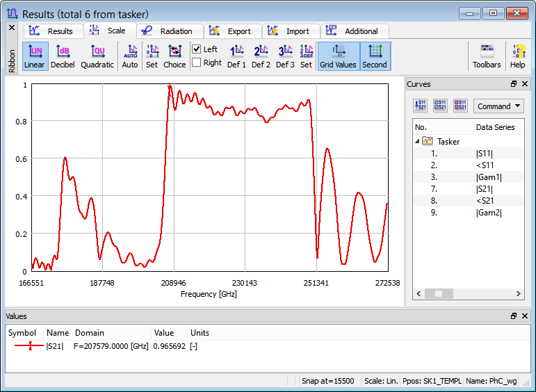 For the purpose of calculating transmission characteristics of the structure, the S-Parameters postprocessing is activated. The S-Parameters postprocessing is set from 166551 GHz to 272538 GHz with a frequency step of 52 GHz.