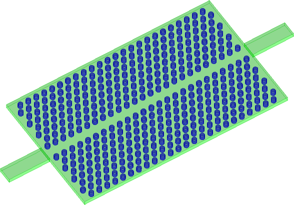 The project consists of planar photonic waveguide manufactured in a 2D hexagonal PhC designed for the purpose of the third telecommunication window (M.Notomi, K.Yamada, A.Shinya, J.Takahashi, C.Takahashi, I.Yokohama, "Extremely Large Group-Velocity Dispersion of Line Defect Waveguides in Photonic Crystal Slabs", Physical Review Letters, Vol. 87, No. 25, December 2001, pp.253902-1 - 253902-4). The considered PhC waveguide is manufactured in 200 nm thick Si wafer (n = 3.26) with air cladding. In principle, photonic crystal lattice (a = 390 nm) surrounding waveguide region is composed of the air holes of radius r = 107 nm. TE polarisation (electric field parallel to the wafer plane) exhibits a photonic bandgap (PBG) inside the PhC region around 1.4μm wavelength. Line defect operating as a PhC waveguide is about 6 μm wide and 10 μm long. Due to symmetry of the excited mode and structure, we can reduce the size of the model imposing electric symmetry in the middle of the waveguide width.