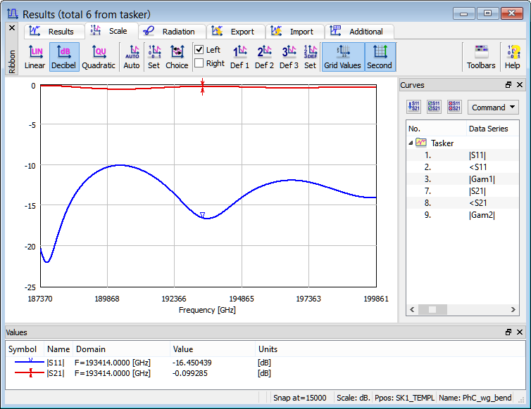 For the purpose of calculating reflection and transmission characteristics of the structure, the S-Parameters postprocessing is activated. The S-Parameters postprocessing is set from 187370 GHz to 199861 GHz with a frequency step of 1 GHz.