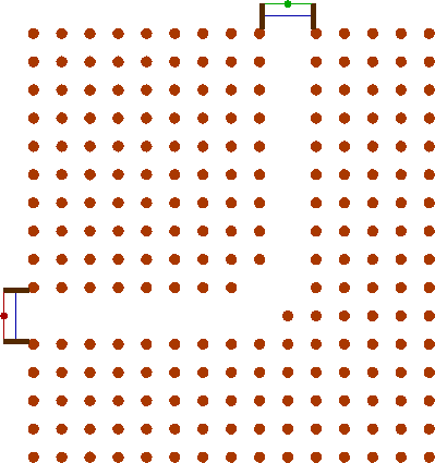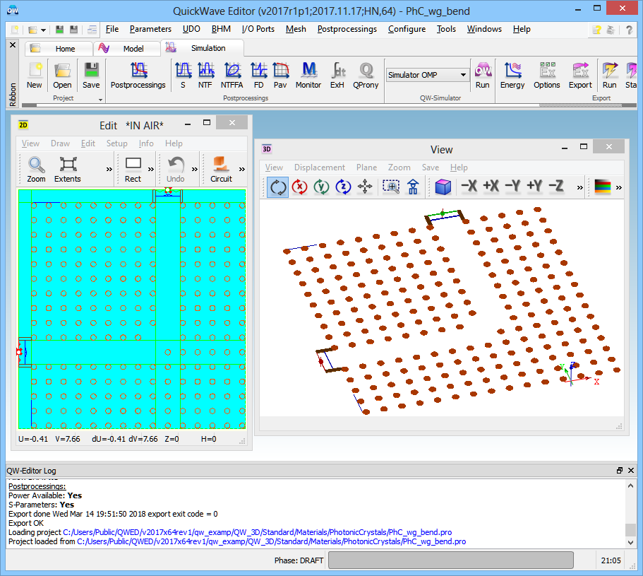 Simulation model considers a sharp 90o bend hollowed in a 2D PhC composed of GaAs rods of radius r = 104 nm distributed with lattice constant a = 580 nm (A.Mekis, J.Chen, I.Kurland, S.Fan, P.Villeneuve, J.Joannopoulos, "High Transmission through Sharp Bends in Photonic Crystal Waveguides", Physical Review Letters, Vol. 77, No. 18, October 1996, pp.3787-3790). Spectrum of a transmitted signal is set in the third telecommunication window at λ = 1550 nm. Proper design of the corner neighbourhood allows us to optimise transmission efficiency.