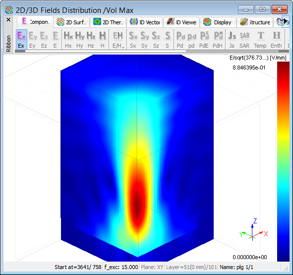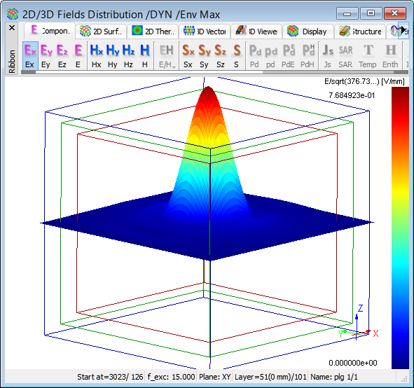 Distribution of time-maximum envelope of Ex field in the central vertical planes at 15 GHz.