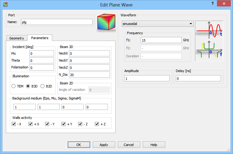 Configuration dialogue of a plane wave box excitation (free space incident wave).