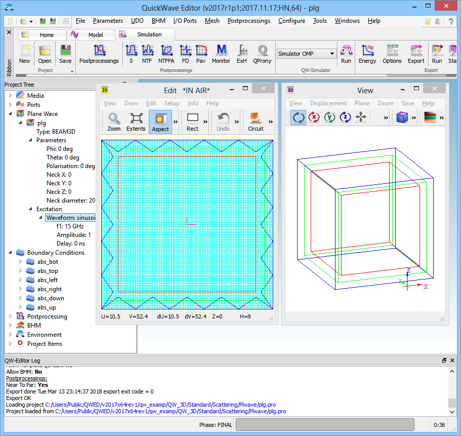Simulation model considers a cubic volume of free space (cube side = 100 mm), with absorbing exterior boundaries (marked as blue box), a surface for near-to-far field transformation (NTF box, marked as reen box) with each wall placed 5 mm from an absorbing boundary and a surface for free space incident wave excitation (plane wave box, marked as red box) with each wall placed 10 mm from an absorbing boundary.
