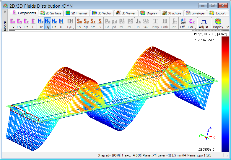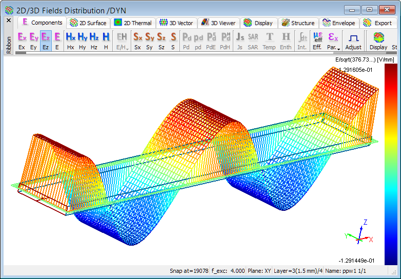 1D view of Ez field component distribution at 4GHz (instantaneous and envelope values).