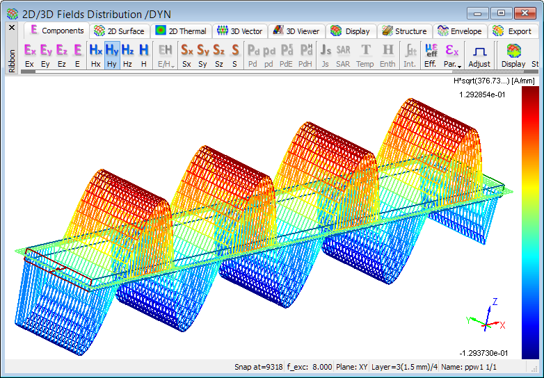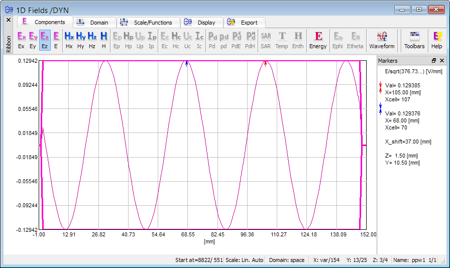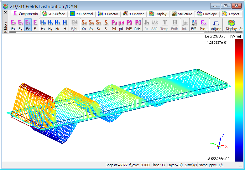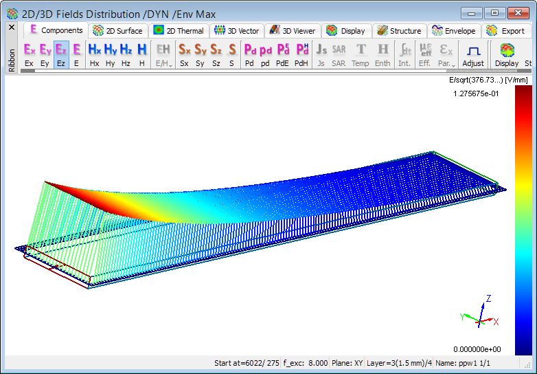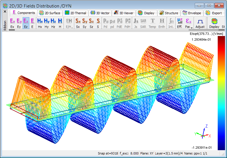 1D view of Ez field component distribution at 8GHz (instantaneous and envelope values).