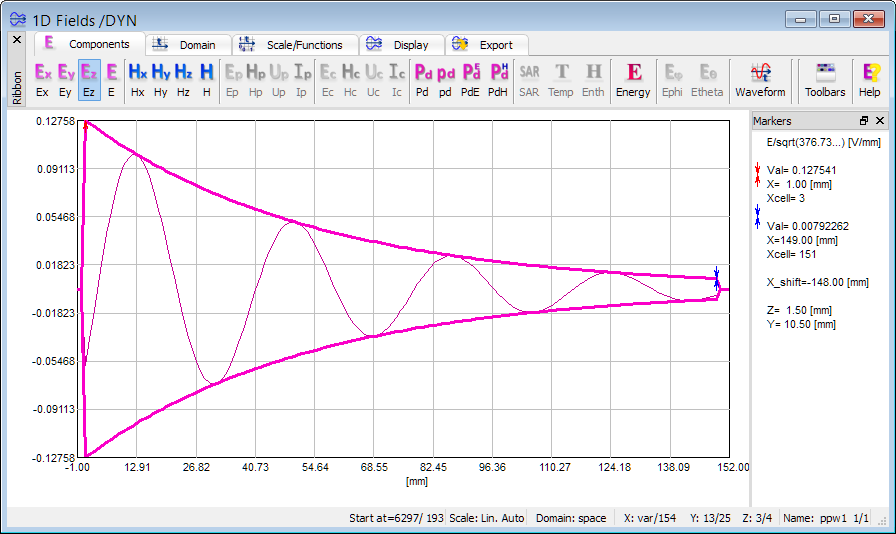 1D view of Ez field component distribution in lossy medium at 8GHz (instantaneous and envelope values).