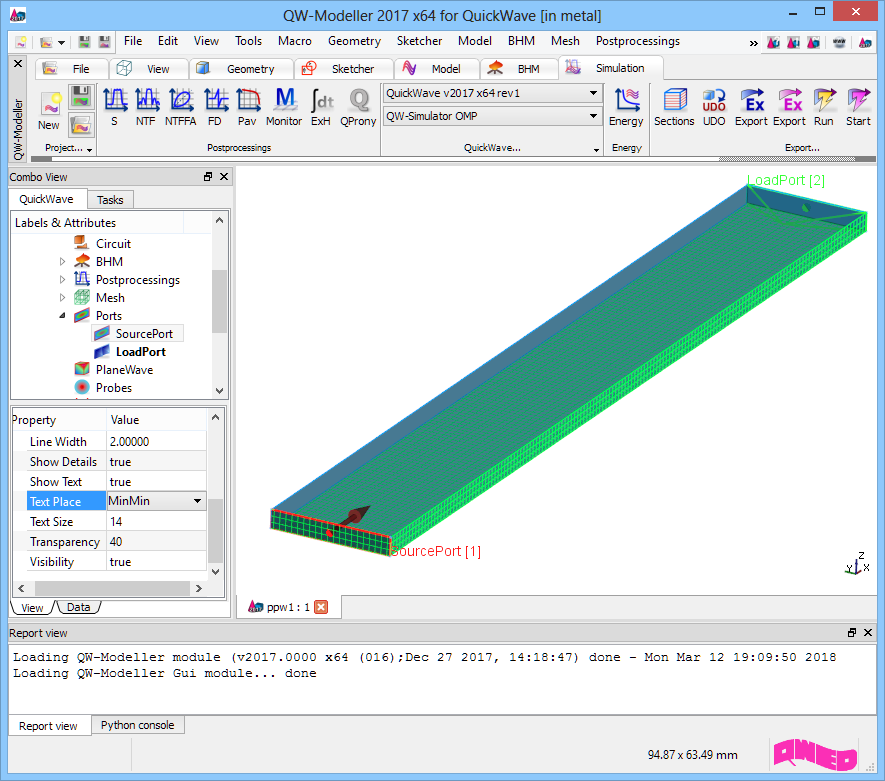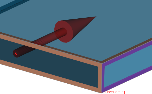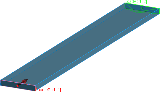 Simulation model presents parallel plate transmission line (violet colour on the both sides indicates PMC boundary conditions) excited with a plane wave (red transmission line port) and terminated with a load port (green transmission line port) matched to the line. The transmission line is filled with air.