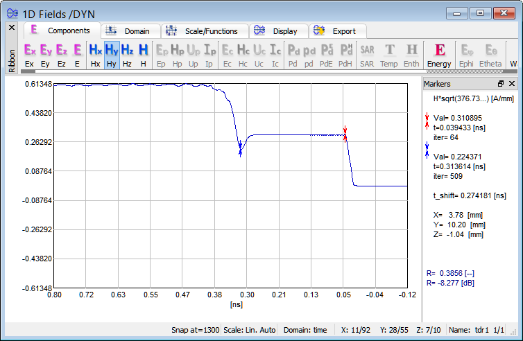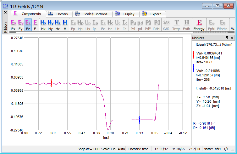 Initially the signal is close to 0. Then when the pulse slope reaches the field testing point, it rises to the incident wave level. The incident wave level is maintained until the wave reflected from the end of the wide line reaches back the field testing point. The narrow line is inductive and thus the reflection coefficient is initially positive (causing that the E-field is amplified). However, since the narrow line is finally short-circuited, the steady state solution must bring reflection coefficient to the value of R=-1 and the field value to 0. The function TDR allows to read the reflection coefficient at any point in time. The reflection coefficient is presented as R=... in linear and dB scale after we place the first (blue) cursor at the point of measurement and the second (red) cursor at the level of the incident wave.