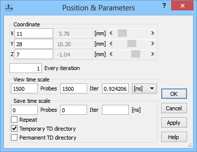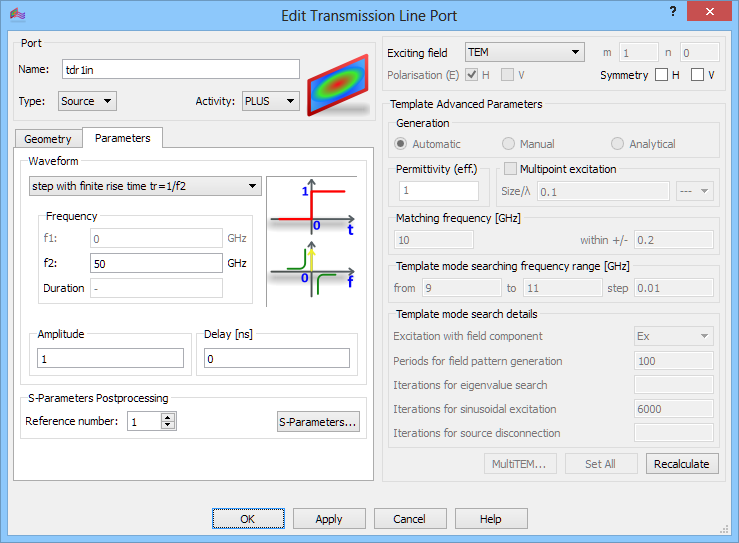 The excitation is a pulse waveform: step with finite rise time dt=1/f2 with f2=50 GHz. Let us justify this choice. In the considered project we use the cell size of 0.4 mm. For correct FDTD analysis the cell size should not be bigger than 0.1 of the wavelength. At 50 GHz the wavelength is 6 mm in air and about 4.2 mm in teflon. Thus with this FDTD mesh we should avoid exciting the circuit at the frequencies significantly higher than 50 GHz. It can be done by introducing a finite rise-time of the pulse.