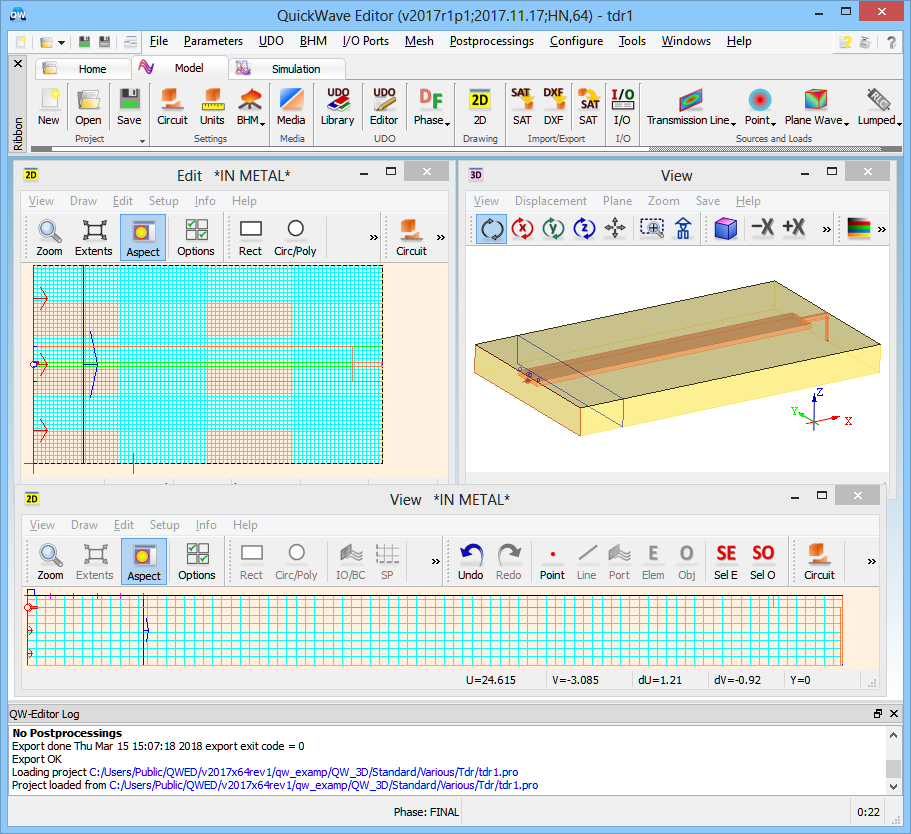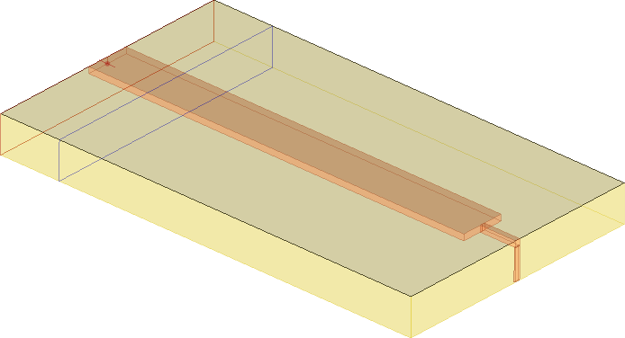 TDR-like signals can be extracted directly from QuickWave simulations. In the present case, simulation models contains a strip-line structure and we are considering a lower half of the structure assuming a magnetic symmetry plane. Substrate is a 6 mm thick teflon. The input strip is 1 mm thick, 3.5 mm wide, and 32 mm long. It is terminated by a grounded strip of width 0.5 mm. During the simulation the structure will be excited by a step pulse and we will be considering Ez and Hy fields below the strip, at the point situated 3.36 mm from the input and thus 28.64 mm from the end of the wide strip.