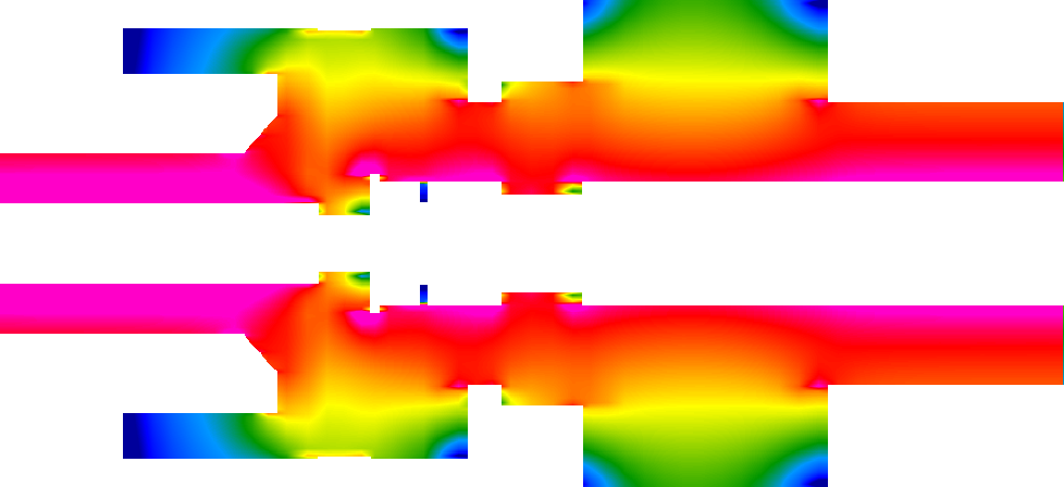 The structure is a coaxial line travelling wave tube. The radii of inner and outer conductor of the input coaxial line are 1 mm and 2.2 mm, respectively. The radii of inner and outer conductor of the output coaxial line is 1.5 mm and 3.5 mm, respectively.