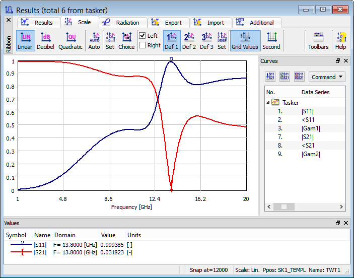 For the purpose of calculating reflection and transmission characteristics, the S-Parameters posprocessing is activated in a frequency range from 1 GHz to 20 GHz, with a frequency step of 0.1 GHz.