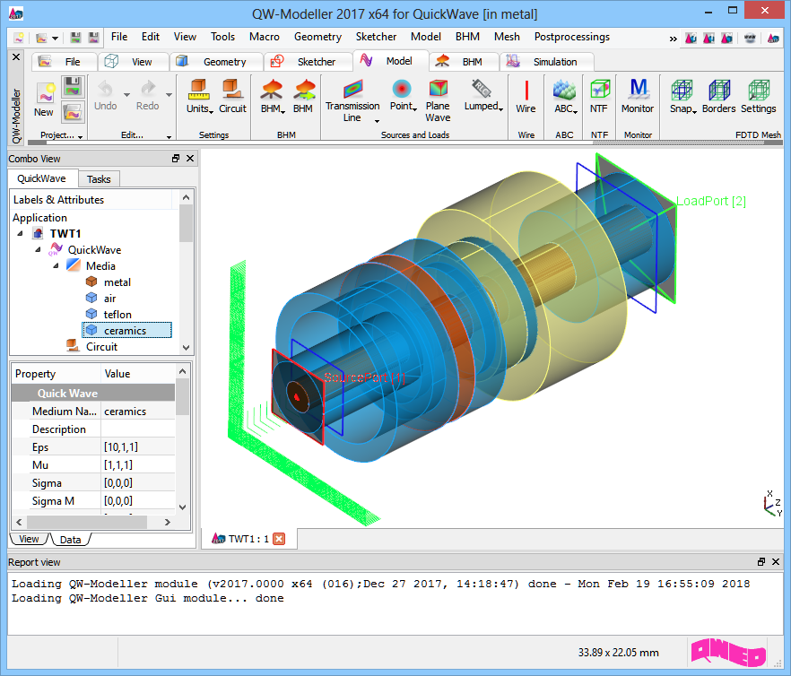 Coaxial line travelling wave tube project in QW-Modeller.