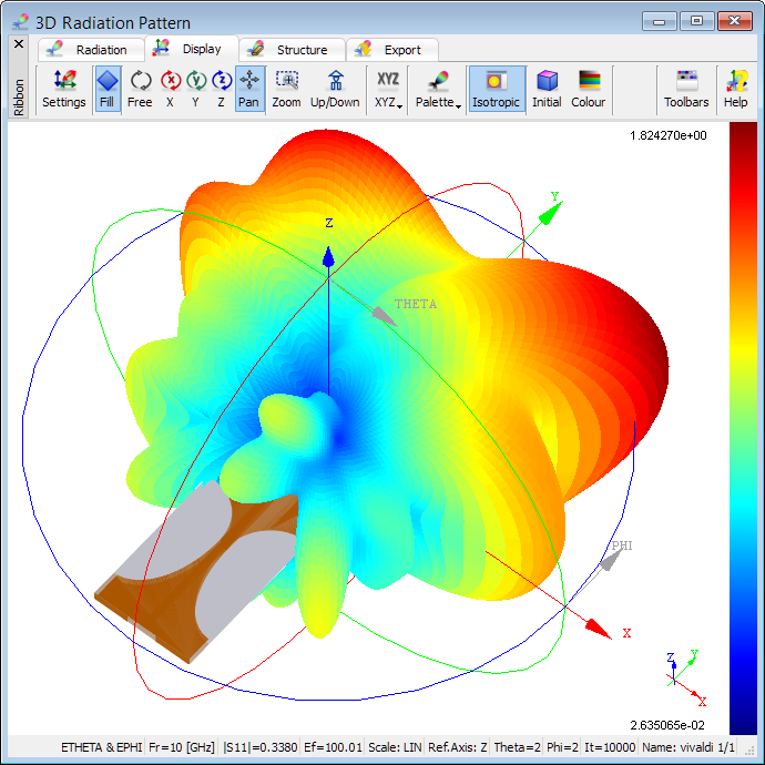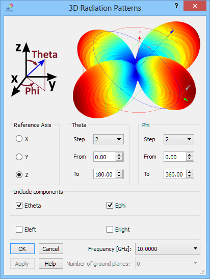 3D radiation pattern, with both Phi and Theta varying in steps can be calculated in the 3D Radiation Pattern window. The 3D Radiation Patterns dialogue allows setting the reference axis and steps for angles Phi and Theta, defined with respect to that axis in the same way as for the 2D radiation pattern case. A single frequency is also selected.