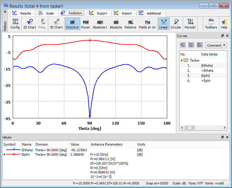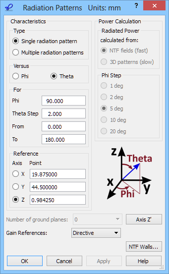 We wish to calculate the 2D radiation patterns versus angle Theta varying between 0 and 180 degrees with a step of 2 degrees. They will be calculated with a constant angle Phi equal to 90 degrees. The definition of the angles is explained in the lower right part of the 2D Radiation Patterns configuration dialogue. Note that this definition depends on the choice of the reference axis. The angle Theta is always counted from the reference axis (Z in the considered example). The angle Phi is always counted around it.