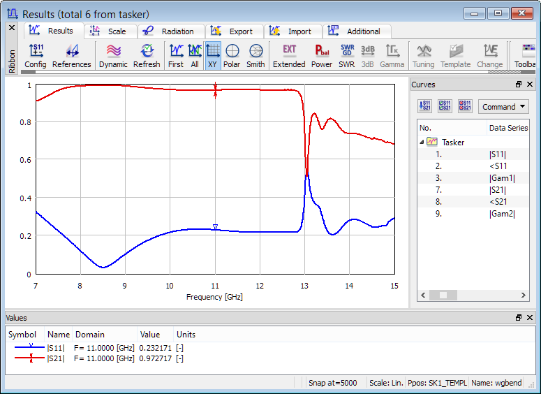 For the purpose of calculating reflection and transmission characteristics, the S-Parameters posprocessing is activated in a frequency range from 7 GHz to 15 GHz, with a frequency step of 0.01 GHz.