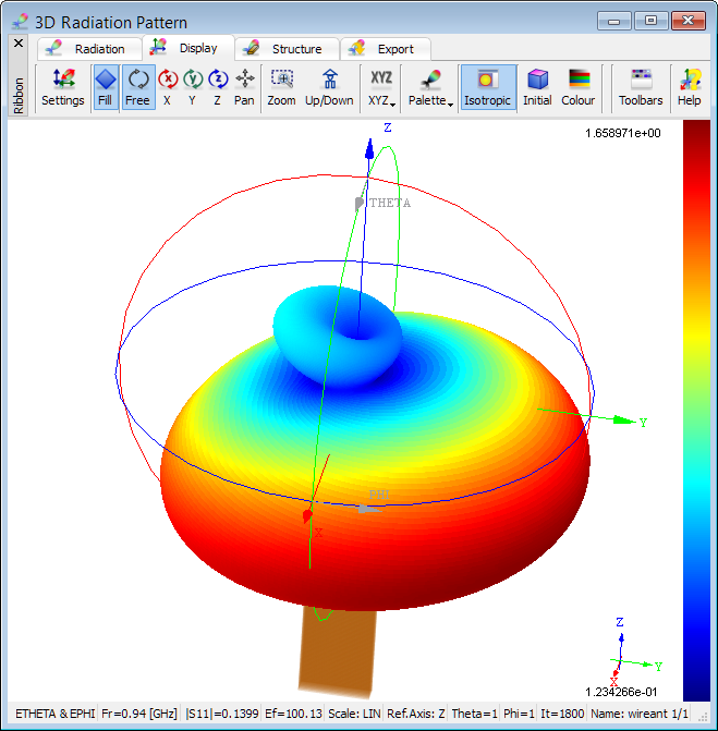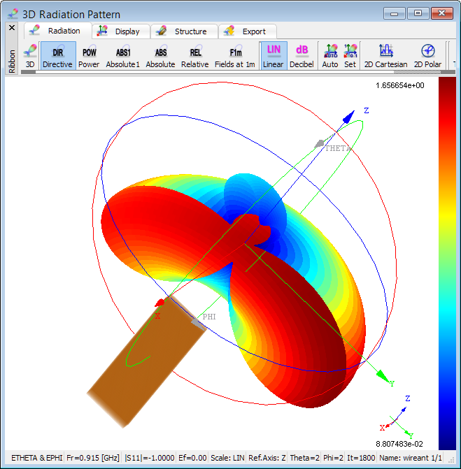 3D radiation pattern, with both Phi and Theta varying in steps can be calculated in the 3D Radiation Pattern window. The 3D Radiation Patterns dialogue allows setting the reference axis and steps for angles Phi and Theta, defined with respect to that axis in the same way as for the 2D radiation pattern case. A single frequency is also selected.