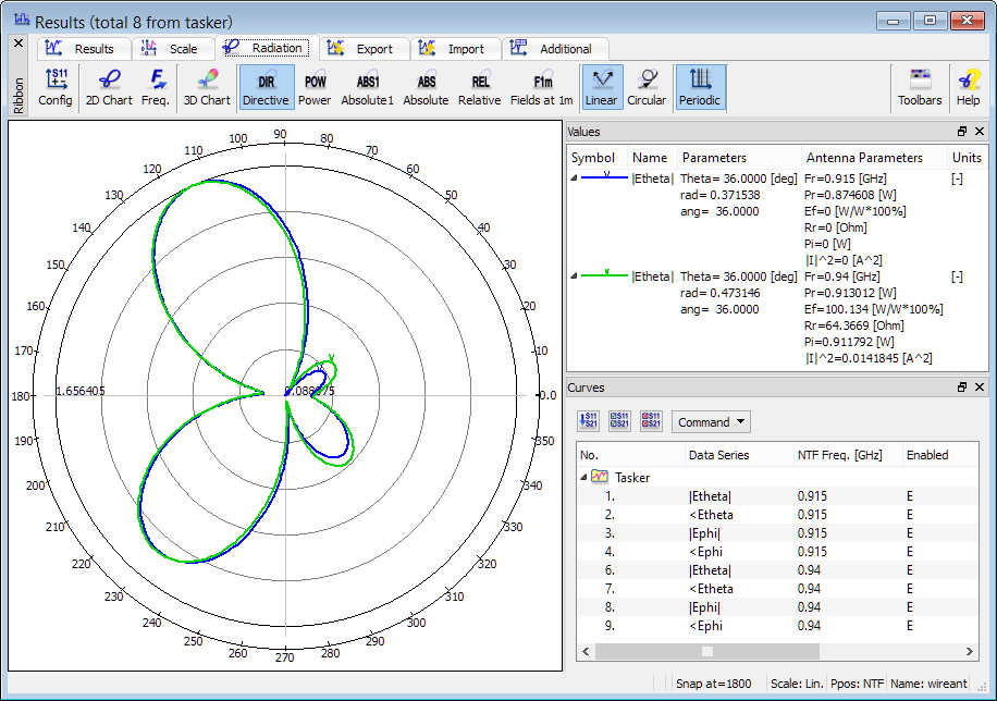 The radiation pattern calculation is set at 915 MHz and 940 MHz.