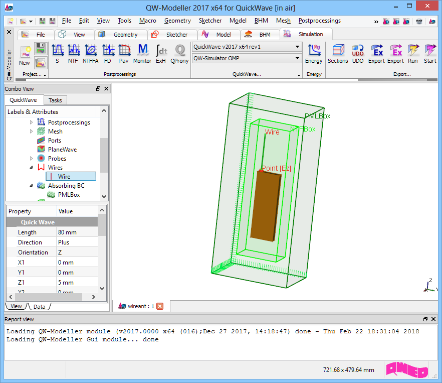 We can set the reference point or in other words the origin of the coordinate system for the NTF transformation. The position of the reference point does not influence the absolute values of the radiation patterns (in lossless NTF background medium) but it does influence their phase characteristics. Moving the reference point can be helpful in a search for the antenna electrical centre. The reference point position is expressed in the same coordinates and units as those used in the project and defined in user input interface. To recall what units have been used, we can just take a look at the title bar of the window. In the considered example we see Units: mm.