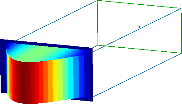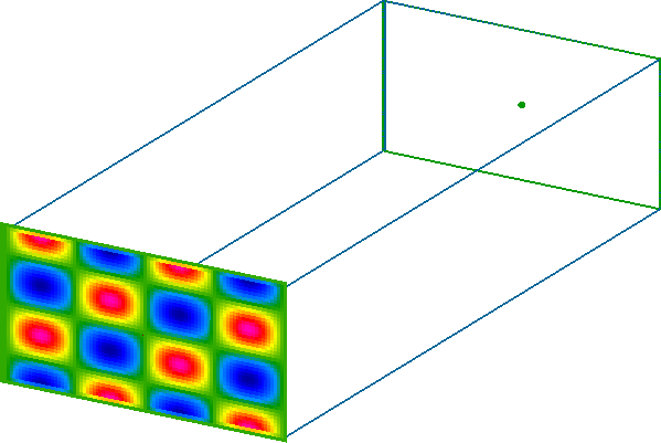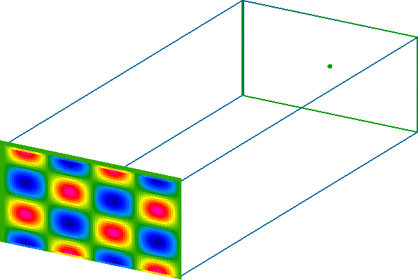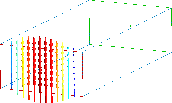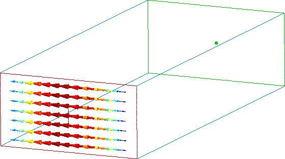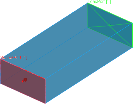 Simulation model presents rectangular waveguide WR-340 excited with a fundamental TE10 mode (red transmission line port) and terminated with a load port (green transmission line port) matched to the waveguide. The waveguide is filled with air.