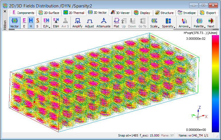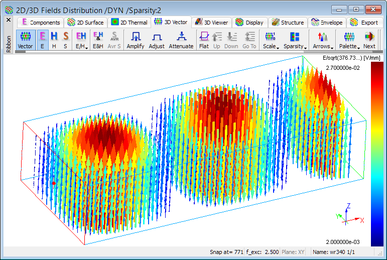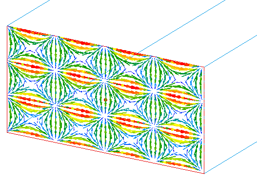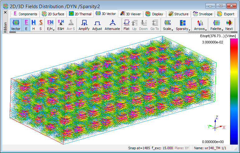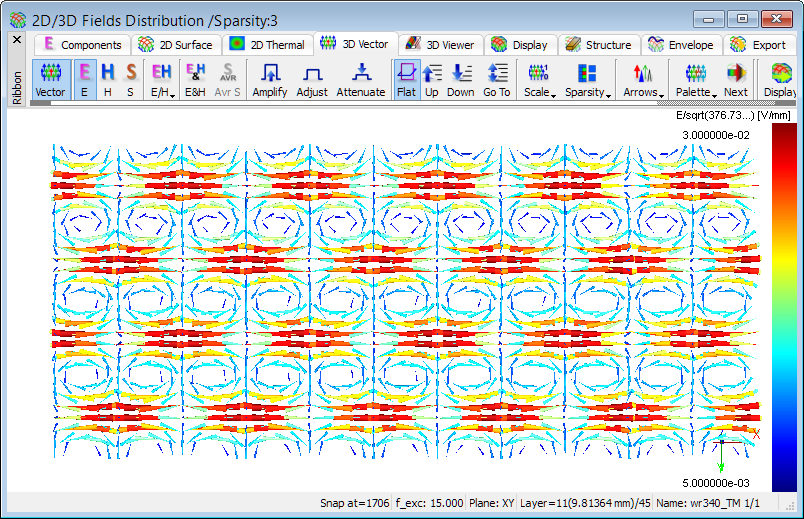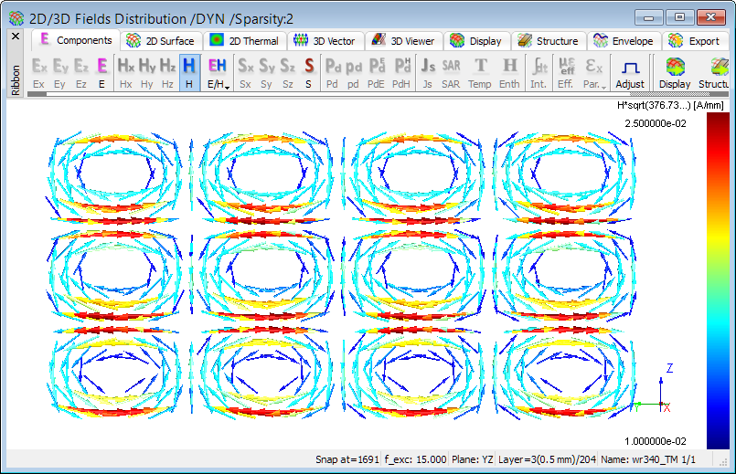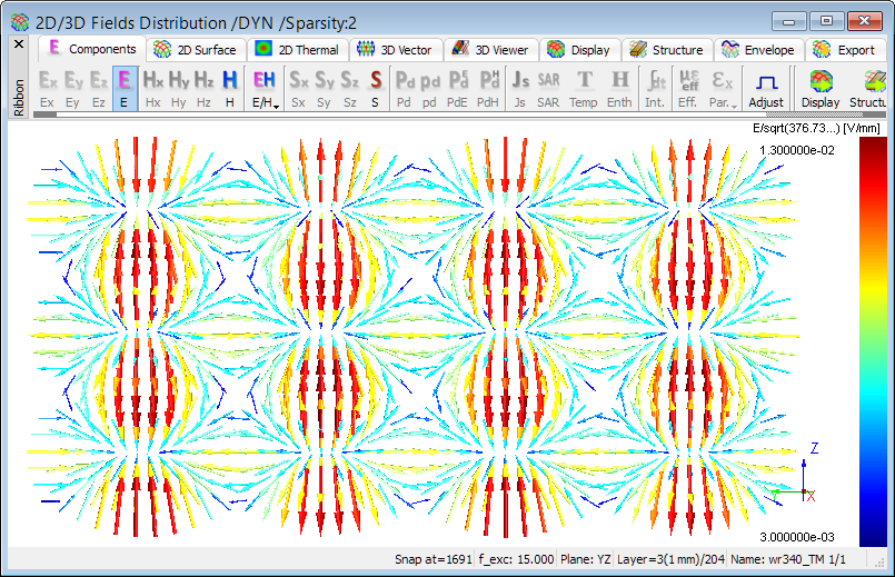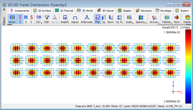 Vector display of electric field distribution for TM43 mode along rectangular waveguide (ZX plane).