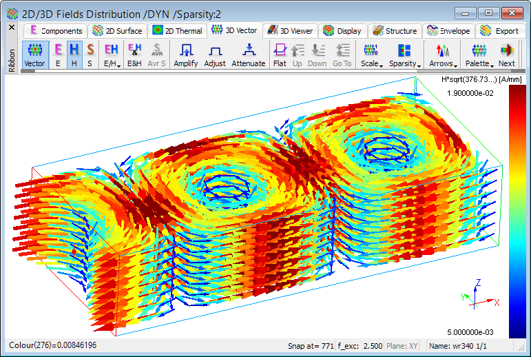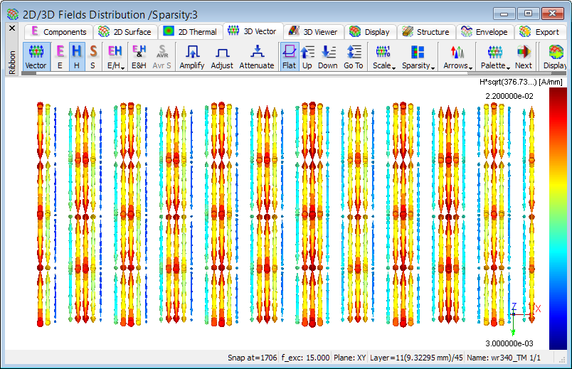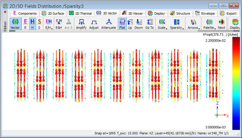 Vector display of magnetic field distribution for TM43 mode along rectangular waveguide (ZX plane).