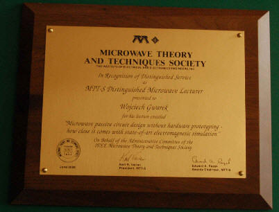 During the Awards Banquet, QWED president prof. Wojciech Gwarek received a prestigious plaque "In Recognition of Distinguished Service as MTT-S Distinguished Microwave Lecturer" for his lecture entitled "Microwave passive circuit design without hardware prototyping - how close it comes with state-of-art electromagnetic simulation".