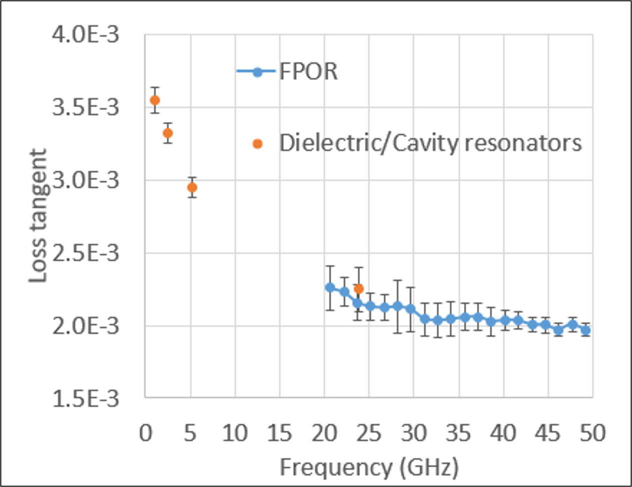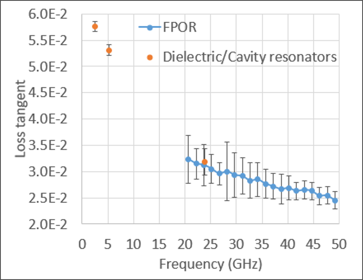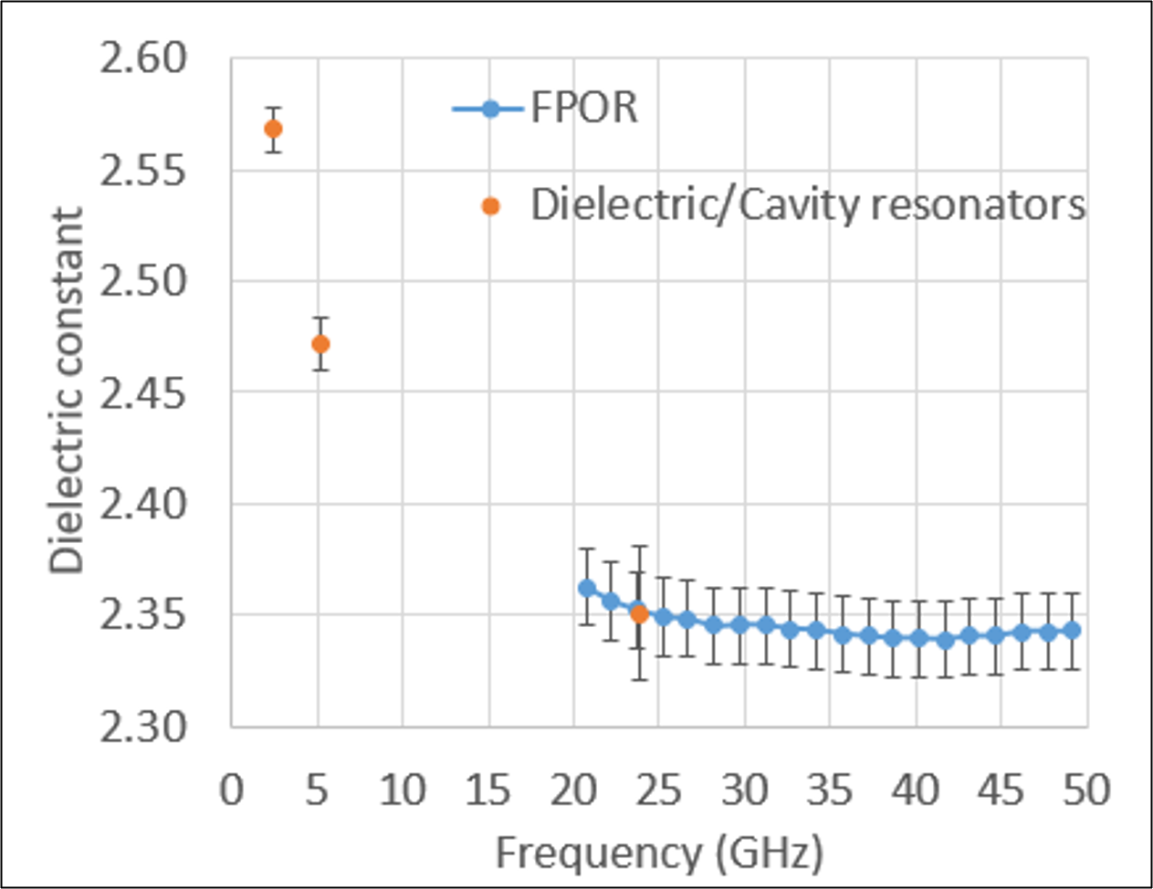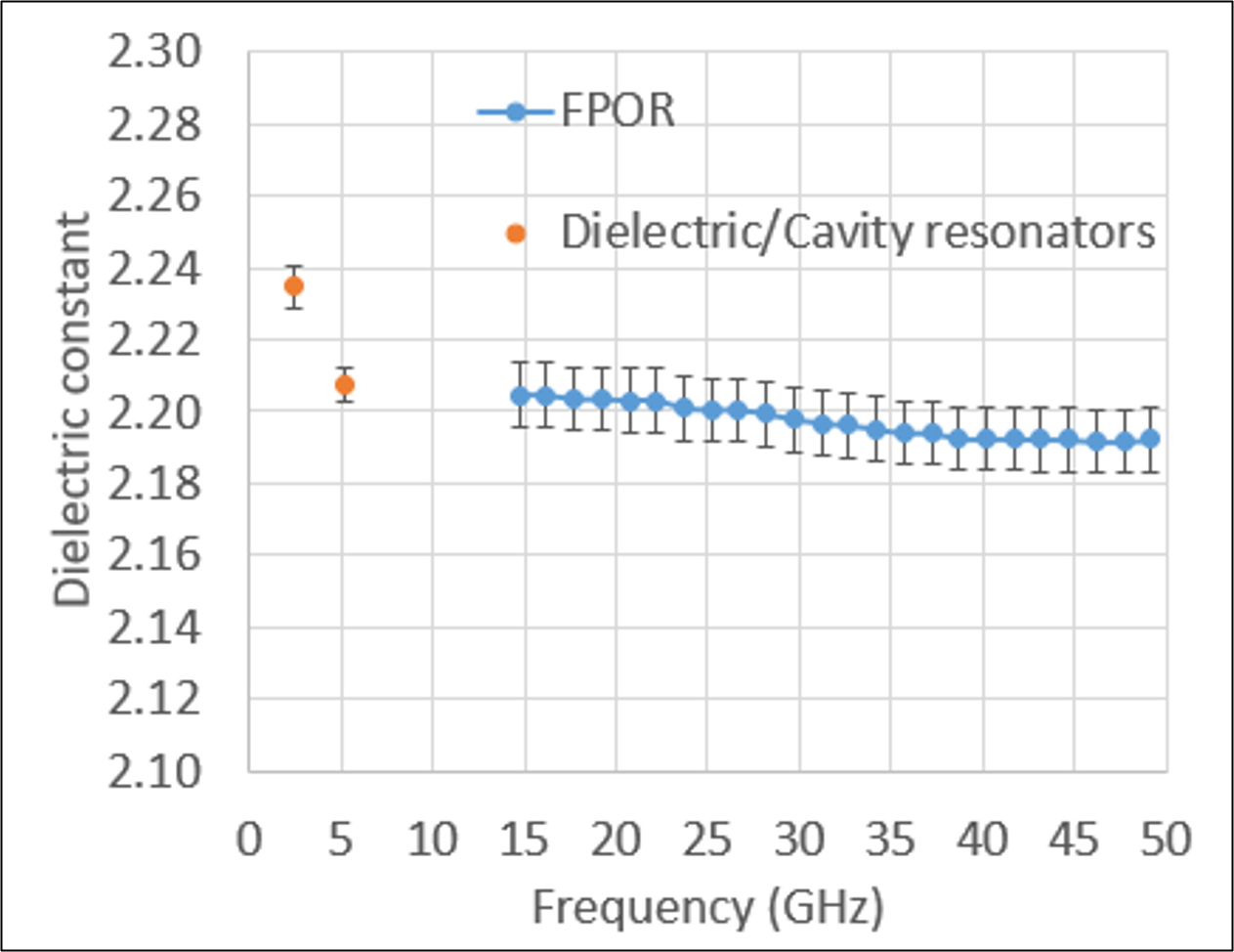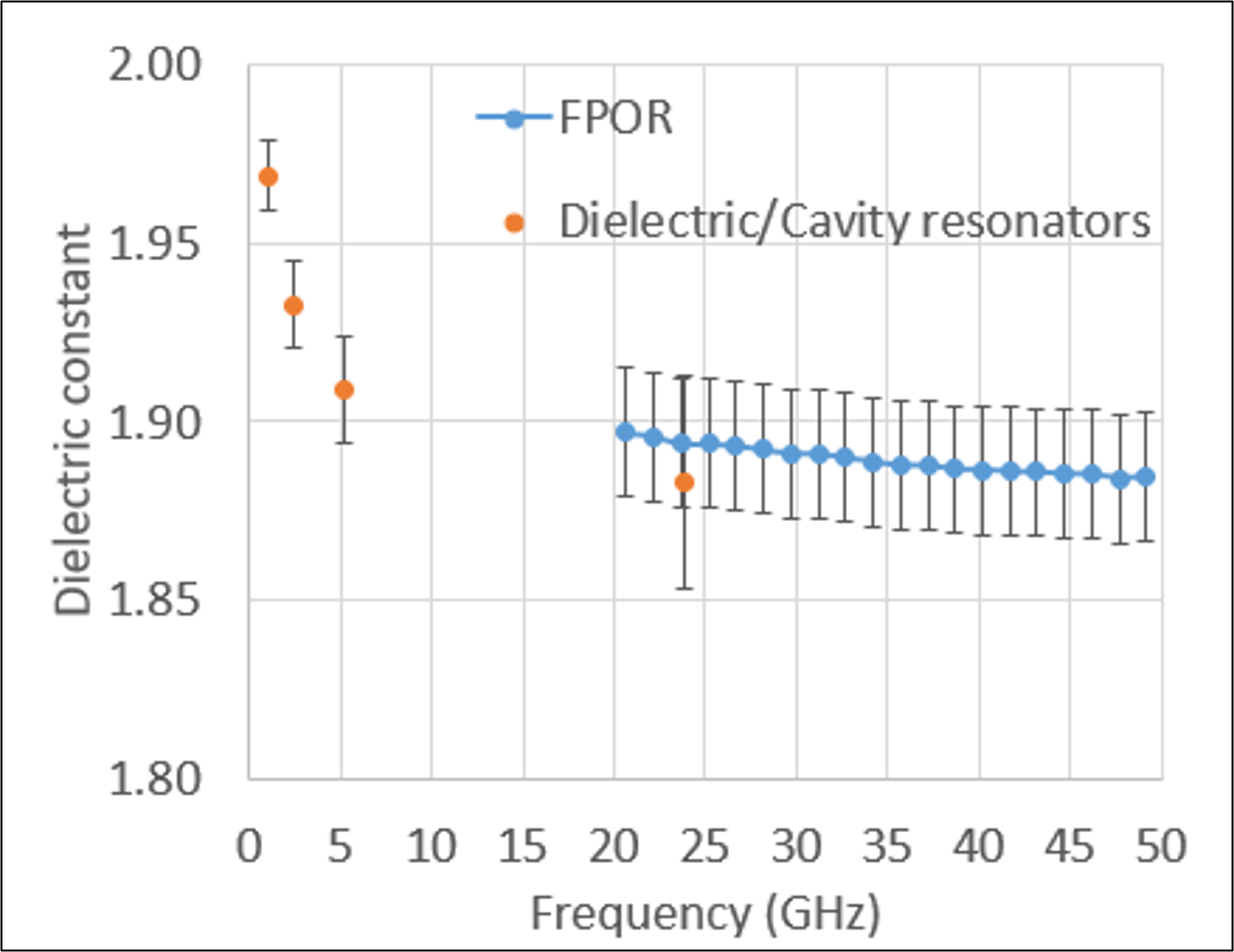 TE01δ mode dielectric and cavity resonators are single-frequency solutions and are offered in the range from 1 to 25 GHz whereas FPOR is a wideband device covering a spectrum of 15 ÷ 50 GHz. Moreover, the fixtures used <25 GHz are adapted to enable measurements of dielectric properties at elevated temperatures up to 100 oC.