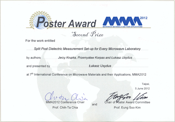 Poster presentation entitled "Split Post Dielectric Measurement Set-up for Every Microwave Laboratory" by Jerzy Krupka, Przemyslaw Korpas and Lukasz Usydus received the Second Prize of Poster Award.