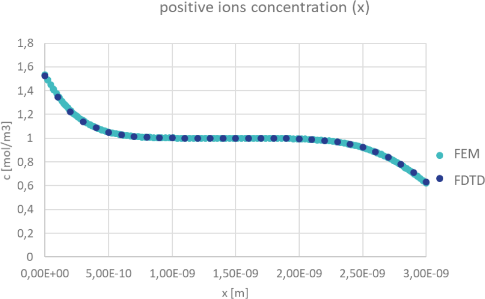 Positive charge concentration distribution in space limited by electrodes of 0.1 V potential difference, filled with electrolyte of εr = 2.82, with initial uniform concentration of positive and negative ions of 1 mol/m3 and Dc=10-9 m2/s.