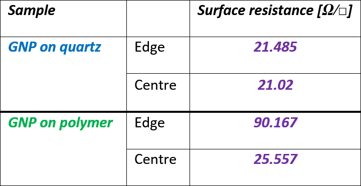 Based on the results gathered in Table 2, deposition of graphene based composite layers on stiff substrate material (quartz) allows for achieving higher homogeneity in electric parameters of the layer than in the case of non-stiff substrates as polymer.
