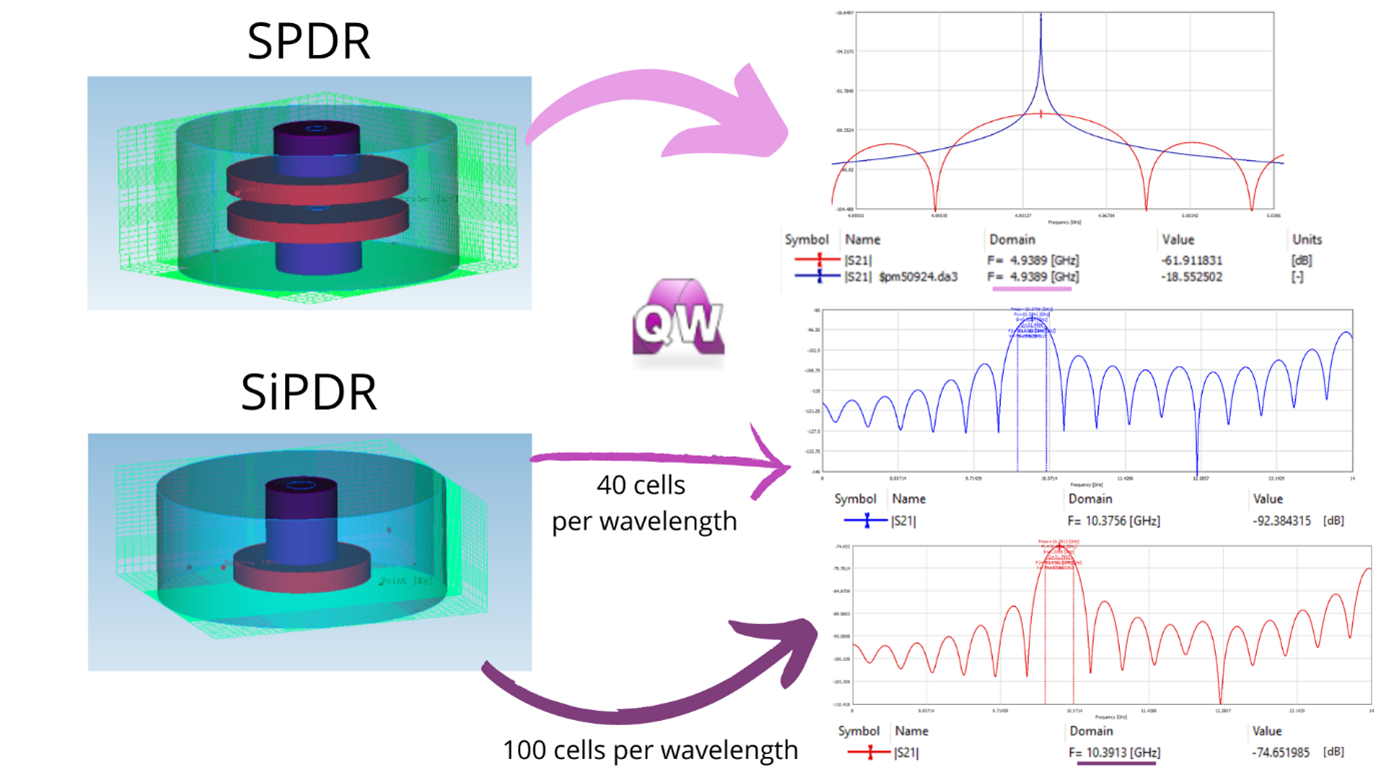 The split-post dielectric-resonators (SPDR) are intended for the contactless measurements of the complex permittivity of laminar dielectric materials including LTCC substrates, but also thin ferroelectric films deposited on low loss dielectric substrates. SPDRs and SiPDRs can be used for the measurements of the surface resistance and conductivity of various conducting materials such as commercial resistive layers, thin conductive polymer films or high resistivity semiconductors. The SPDR technique is applicable to high-resistivity semiconductors having the resistivity from 100 Ω•cm to 10 000 Ω•cm. When materials with lower resistivity need to be measured, single-post dielectric-resonator (SiPDR) is used, whose sensitivity range is from 10-5 Ω•cm to 100 Ω•cm. For this reason, it is used to study metamaterials as well as semiconductor wafers. The combination of both measurement methods allows for a large range of absolute resistivity determination. These techniques allow resistivity mapping and measurements of material properties versus temperature. The above resonators were designed in QW-Modeller software freely available as examples. In both models there are no samples placed. Using the latest version of the QuickWave simulator, the Direct Fourier Transforms of the signals at the ports have been calculated in post-processing called S-Parameters. From these results the S21 parameter was selected from which the maximum was determined. At this point the 3dB bandwidth on the decibel scale was calculated and shown. The results obtained from QuickWave have been compared with Vector Network Analyzer (VNA) and are in agreement with each other.