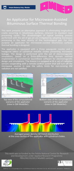 The aim of the project coordinated by The Road and Bridge Reasearch Institute (IBDiM), is to elaborate the model of a device for thermal bonding of bituminous surfaces that takes the advantage of a microwave heating phenomenon. The major goal will be thermal bonding of technological longitudinal joints occurring in bituminous road surfaces, such as joints of independently paved adjacent road lanes or cracks occurring on a road surface. Innovation in the project will be the application of non–ionizing microwave radiation at unlicensed ISM band, 2400-2500 MHz, as an effective method of quick heating at technological joints of bituminous surfaces. The project will solve significant technological issues of effective bonding of bituminous surfaces, thus, remarkably influencing road durability.