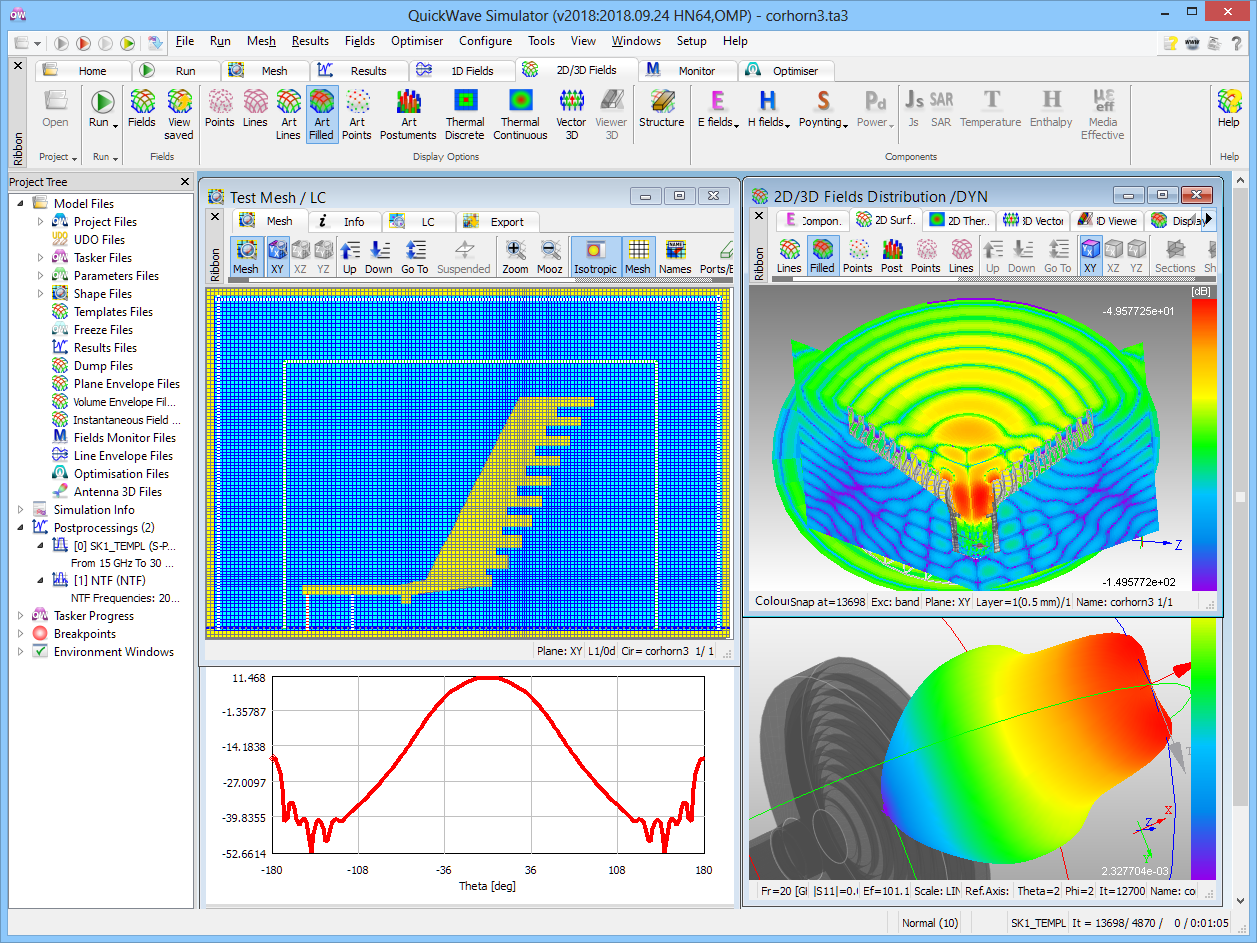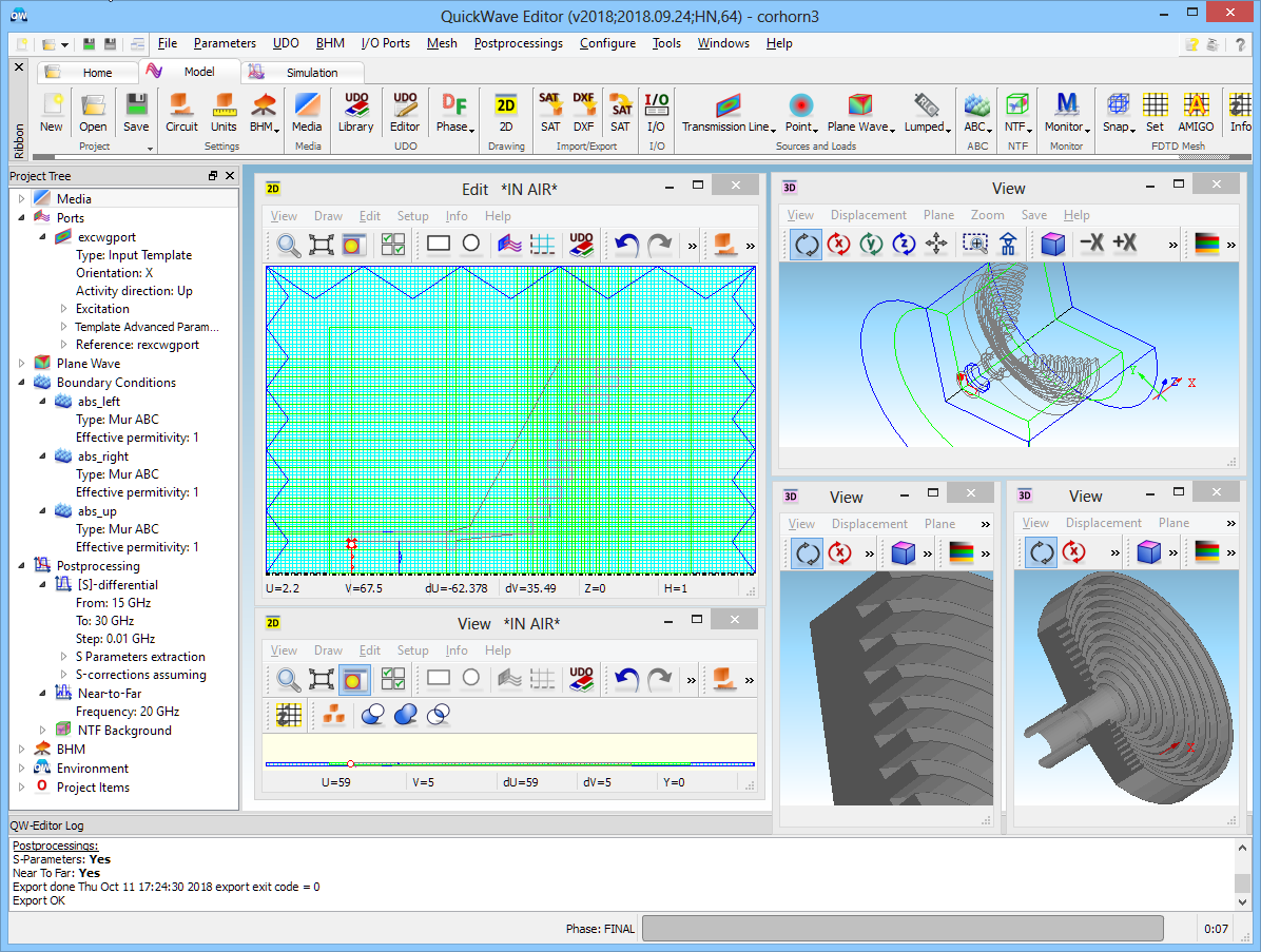 calculations of radiation patterns, gain, radiation efficiency, and return loss of axisymmetrical antennas of various types (horn, rod, biconical), rigorously taking into account irregular geometry, complicated corrugations, and inhomogeneous filling