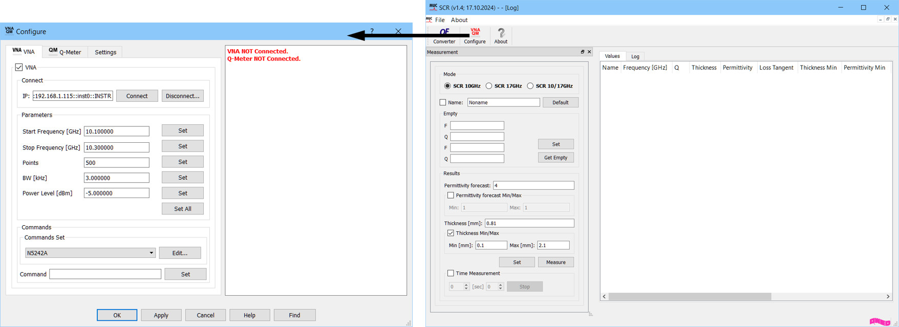resonant frequency and quality factor measured for a sample-loaded Q-SCR