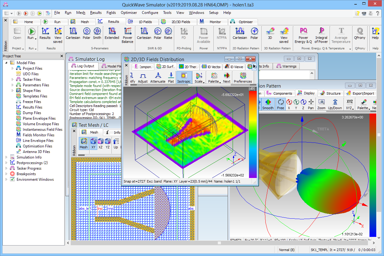 Our longstanding experience in EM modelling shows that the simulation speed is an important issue. Radiation pattern calculations for very complicated or very big problems can constitute a significant part of the total computation time. In this release we focused on enhancing the speed of calculations algorithms for radiation pattern extraction. The calculating procedures were optimised to achieve a maximum speed of calculations – the sequential procedures are over 20% faster compared to previous version 2018 and over 35% compared to the earlier versions of QuickWave. Radiation pattern calculations have been fully parallelised for multiple NTF frequencies analysis.