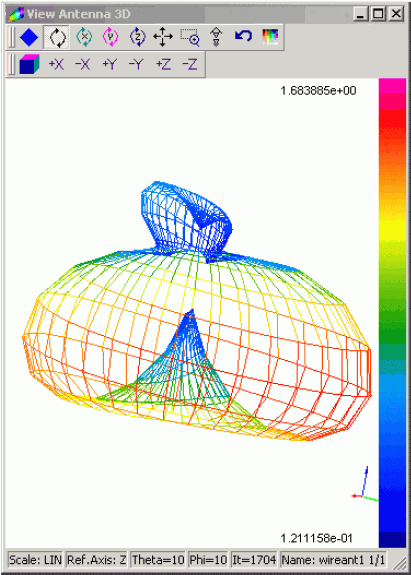QW-3D software can calculate full 3D radiation patterns, with varying both phi and theta angles. In earlier software versions, these results could be visualised by export to HOOPS 3D Part Viewer for ACIS(c). Starting with version 6.0, an internal OpenGL window has been implemented for this purpose. Besides a variety of display options, it allows scale control and switching between linear and logarithmic scales, see e.g. Section UG 2.3.4.