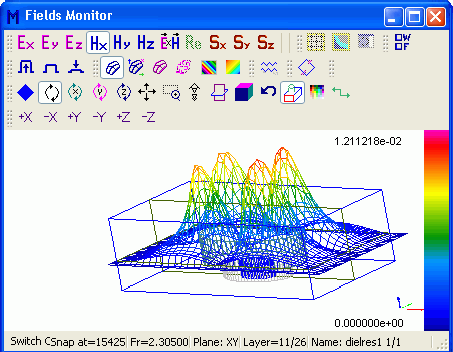 A great advantage of QuickWave software is that new windows monitoring time-domain variation of the fields may be open at any time and set to any plane and any component. In some cases, the user may be interested in frequency-domain field magnitudes of just some components and in some sections. So far this has been possible via multiple runs at the selected frequencies. In version 6.0 a new Field Monitor postprocessing has been added. In pulse excitation regime, it Fourier-transforms time-domain fields at pre-selected frequencies, in-pre-defined planes. Example of application is shown in Section UG 2.5.1 and options for display control are described in Section S 2.4.1.