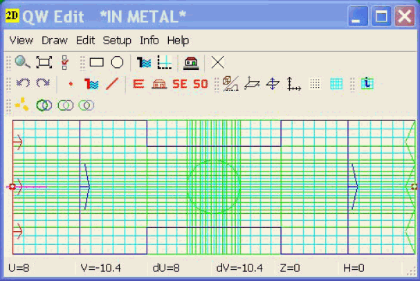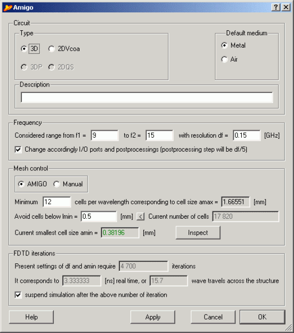 The most important element of the new QW-Editor is the AMIGO system. AMIGO formally stands for the Advanced Mesh Intelligent Generation Option but it really plays a very friendly role, in accordance with the abbreviated name. It serves two purposes. Firstly, it optimises the meshing so as to provide requested wavelength resolution in all media while avoiding small cells. Secondly, it allows fast setting of frequency ranges for all ports as well as S-parameter and FD-Probing postprocessings. Additionally, it shows useful information about: details of structure definition that cannot be modelled within requested mesh constraints, time step forced by the current mesh, expected duration of the analysis, and allows setting automatic stop criteria.