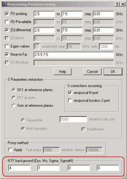The near-to-far field transformation is usually applied in air, being the most typical environment for antennas. However, there are cases when transforming near fields to far fields in homogeneous media other than air is of interest. These may be biomedical applications or other cases of microwave propagation in large bodies. NTF transformation in lossless homogeneous dielectrics was provided in version 5.0, and now in version 6.0 it has been extended to lossy media. The region between the NTF box and absorbing boundaries must be homogeneous but may be filled with a medium of arbitrary permittivity er, permeability µr, conductivity sigma and magnetic loss sigmam. Please refer to Section UG 2.3.6 for examples of application and description of normalisation used.