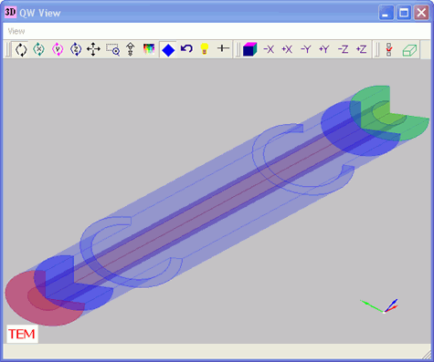 In previous versions of QW-V2D, we concentrated on applications with circular waveguide inputs. Calculating coaxial structures with TEM excitation was possible, but the mode template had to be extracted by the general arbitrary dynamic procedure, which was inconvenient in a quasistatic case. Up to version 6.5, the recommended package for specific coaxial applications was QWCX. We are now withdrawing QWCX and enhancing QW-V2D also for coaxial connector applications. Thus we have introduced TEM template extraction at coaxial ports via one-dimensional quasi-static (1D QS) procedure, as used in the example of Section V2D 2.9.