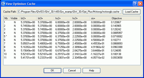 During optimisation and grid search, consecutive steps are stored in cache. A new View Optimiser Cache command has been implemented for inspecting these data. After loading a selected cache file, the user obtains a set of columns with values of optimisation / grid search variables at consecutive steps. The last column show the value of the optimisation objective. More details are given in Section 3.5.5. Note that a valid QW-OptimiserPlus licence is needed for use of View Optimisation cache.