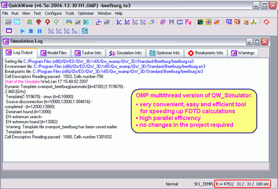QW-MultiSim, the family of multithread implementations of QW-Simulator for multiprocessor machines, has been enriched with a new OMP version (ker1omp.exe). This version uses OpenMP programming standard (www.openmp.org) to accelerate the FDTD loop. The default number of created threads in the Visual C++ implementation of the OpenMP standard is equal to the number of virtual processors, including hyperthreading CPUs. The user can control this number by setting “OMP_NUM_THREADS” system environment variable. The OMP version speedup depends on number of processors and computer architecture. Moreover, it is also model dependent. For large 3D models we have observed 1.8 speedup on PC computers with 2 physical processors (not cores, not HT). The user can run ker1omp.exe without any changes in the model prepared for the sequential QW-Simulator.