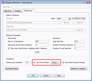 Use Prony Module in the Preferences Tab in Configure Optimiser dialogue allows using of Prony Module in the Optimisation. This option is available only if the Prony Module licence is active. After checking it, the Prony button is available and it opens the Prony Module Settings dialogue, where the user can set parameters for Prony Module. Note that there is no need to additionally make the Prony Module settings in QW-Editor, and if such settings are made, they will be ignored during Optimisation.