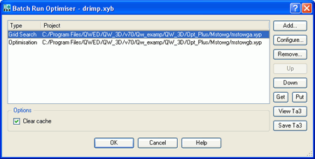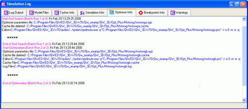 Starting with version 7.0, it is possible to set up a batch job for making several consecutive runs of Optimisation or Grid Search. Messages informing that QW-OptimiserPlus works in the Batch Run mode will appear in the Optimiser Info tab of the Simulation Log window.